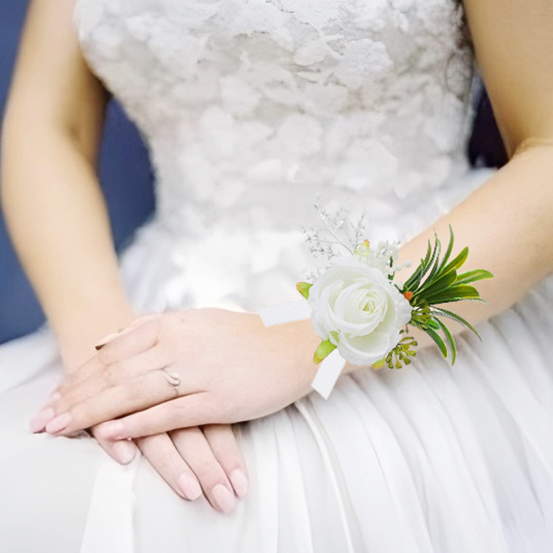 結婚式の新郎様や参列者の胸元を華やかに彩るコサージュです。 中央に咲く清楚な白い薔薇を、生き生きとしたグリーンリーフと繊細な小花が優しく囲み、ナチュラルな美しさを演出します。 麻紐風の茎部分と透け感のある銀色のリボンが洗練された印象を与え、格式高い結婚式にもふさわしい上品な仕上がりです。 胸元に装着するだけで、特別な日の装いを一層引き立てます。