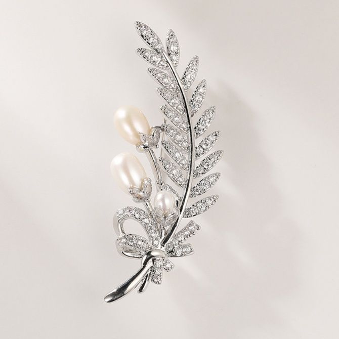 繊細な葉のモチーフに輝く装飾と上品な真珠を組み合わせた、華やかなコサージュです。