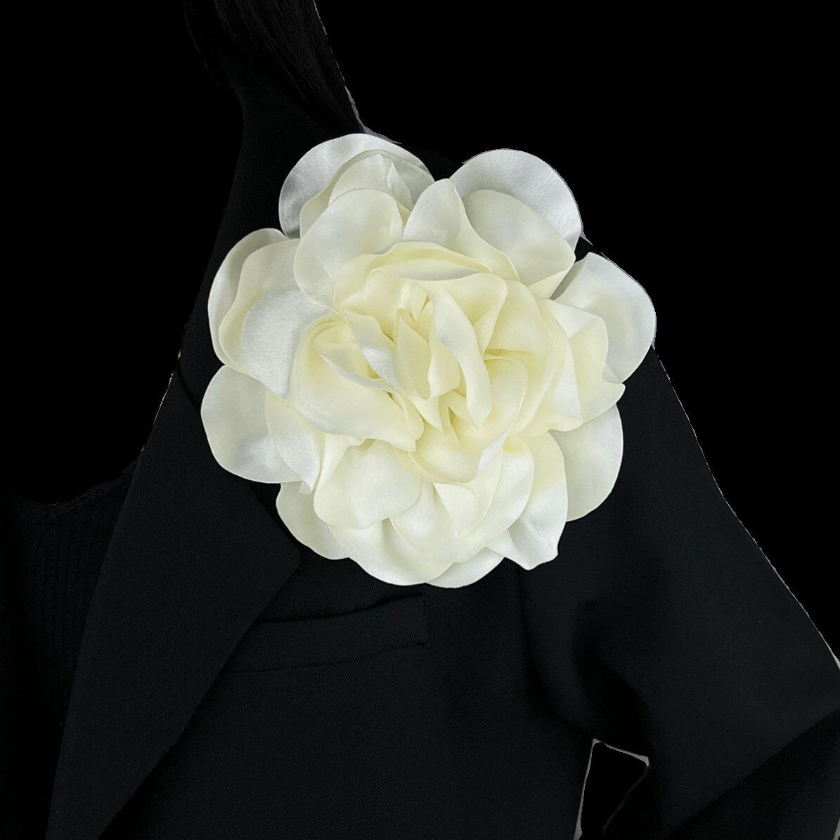 光沢のあるサテン生地を幾重にも重ねて仕上げた、華やかな大輪花のコサージュです。