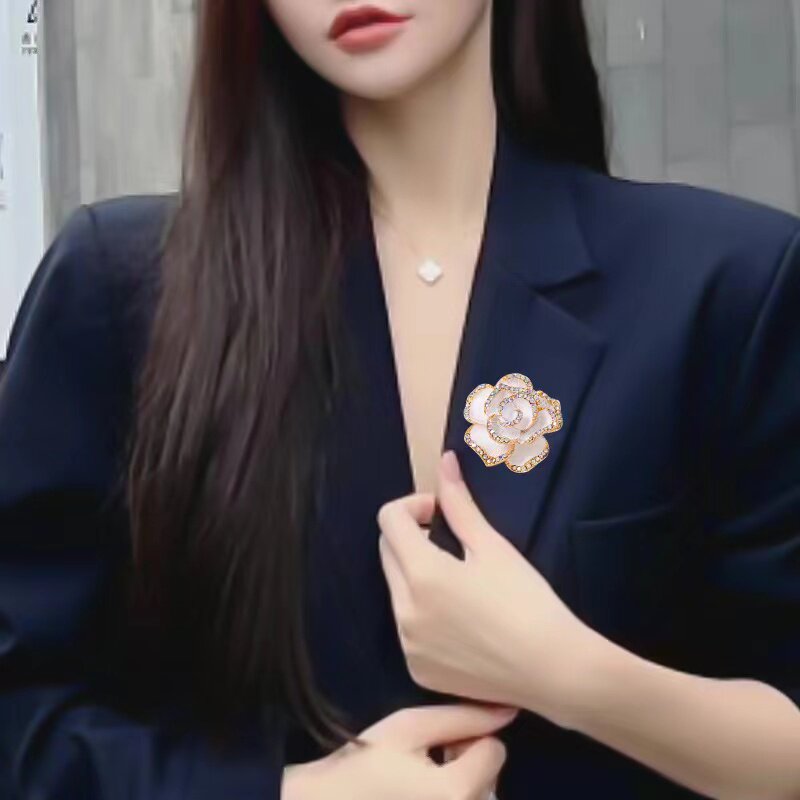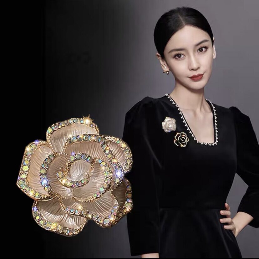 繊細な薔薇の花びらを立体的に表現した卒業式にふさわしいコサージュです。 花びらの縁取りに贅沢にあしらわれた輝石が上品な煌めきを添え、フォーマルな装いを一層華やかに演出します。 胸元に添えるだけで洗練された印象を与え、卒業式などの特別な日の装いを格上げしてくれる逸品です。 ブローチタイプで簡単に着脱でき、スーツやジャケットとの相性も抜群です。