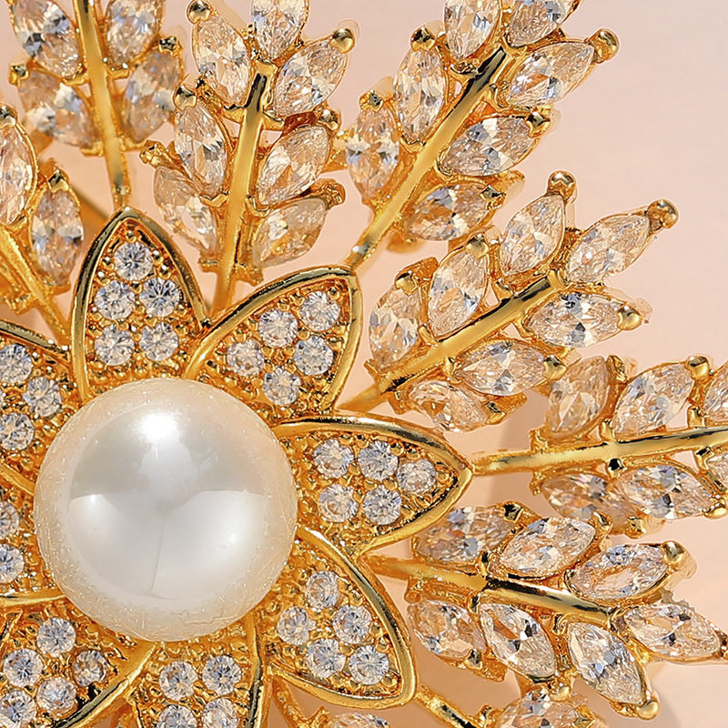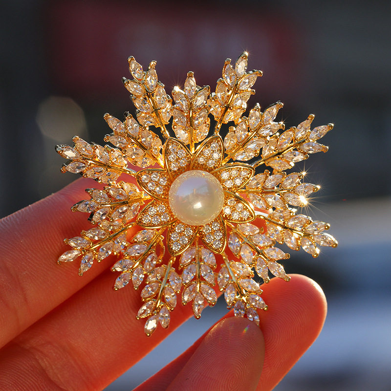 入学式の装いを一層華やかに彩るコサージュです。 中心に配された上品なパールを囲むように、繊細な輝きを放つ雪の結晶を思わせるデザインが特徴です。 立体的に広がる花びらのような装飾が胸元を優雅に演出し、フォーマルな場面でも存在感を発揮します。 入学式などの大切な式典にふさわしい、格調高いコサージュとして長くご愛用いただけます。