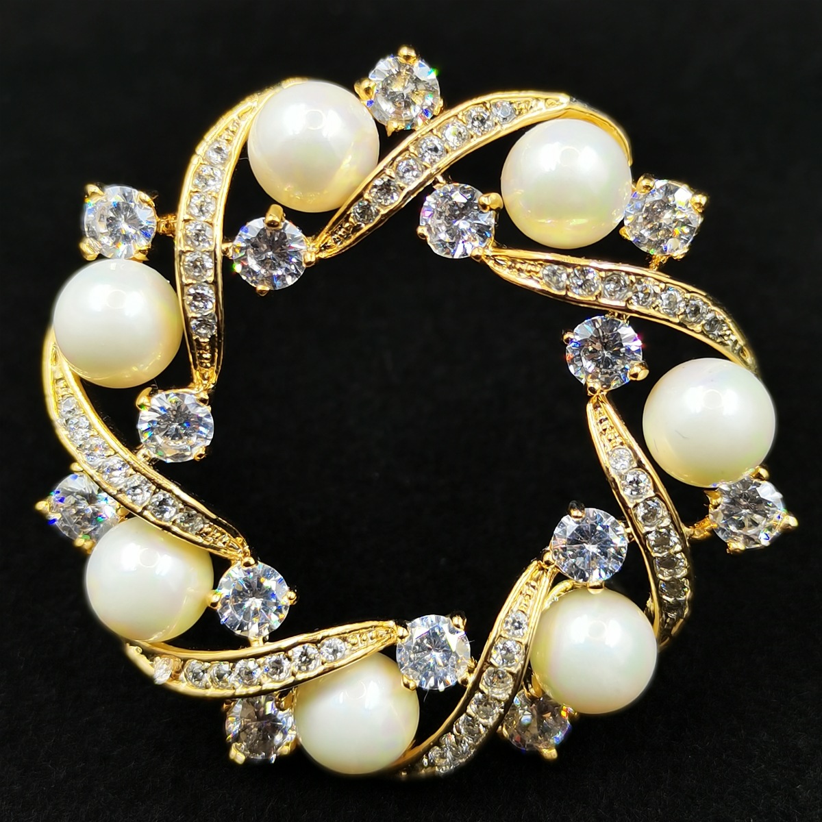 優雅な曲線が織りなすリース型のデザインが魅力的なコサージュです。