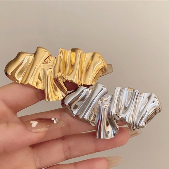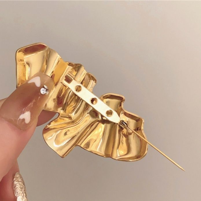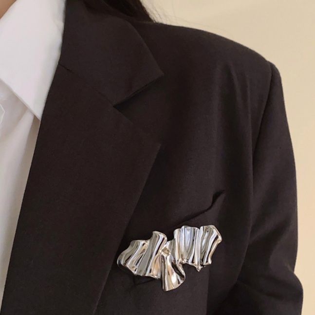 光沢のある金属素材を波打つように造形した個性的なリボンデザインのコサージュです。